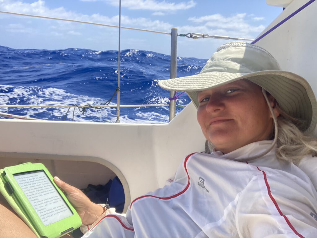 Halbzeit! Also Halbstrecke. Abends ist es soweit, dass es bis nach Mindelo und bis nach Martinique exakt gleich weit ist. Wir hoffen, dass die zweite Streckenhälfte nicht genauso lange dauert wie die erste. Aber wir haben jetzt den Passatwind gefunden. Oder er uns? Egal. Er verspricht uns eine Woche mit konstanten 20 Knoten. Wir freuen uns schon konstant mehr als 15 zu haben. So langsam kommen wir aus der Phase „boah noch so lange“ in ein „hey, gar nicht mehr so lange“ und das ist auch gut so, denn nach zwei Wochen stellen wir schon fest, dass so lange Überfahrten nicht unsere Lieblingsdisziplin werden. Es schlaucht, alles ist zäh. Wir sind müde. es dauert zu lange. Wir haben inzwischen voll in den Bord-Rhythmus gefunden, aber an das Rollen gewöhnt man sich nie. Es nervt. Rollen bedeutet, dass das Boot sich durch die Wellen aufschaukelt und immer nach rechts und links rüber kippt. Kann man super draußen im Cockpit stehend in den Knien mitsurfen. Für jede andere Tätigkeit und dazu zählt auch sitzen, ist es allerdings nervig.