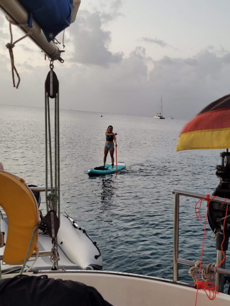 Sonst genießen wir das karibische Leben vor Anker. Gehen im klaren Wasser schwimmen und Schnorcheln, angeln fragwürdige Fische, gehen am Strand spazieren und Schildkröten entdecken vom Stand-up-Paddel-Bord.