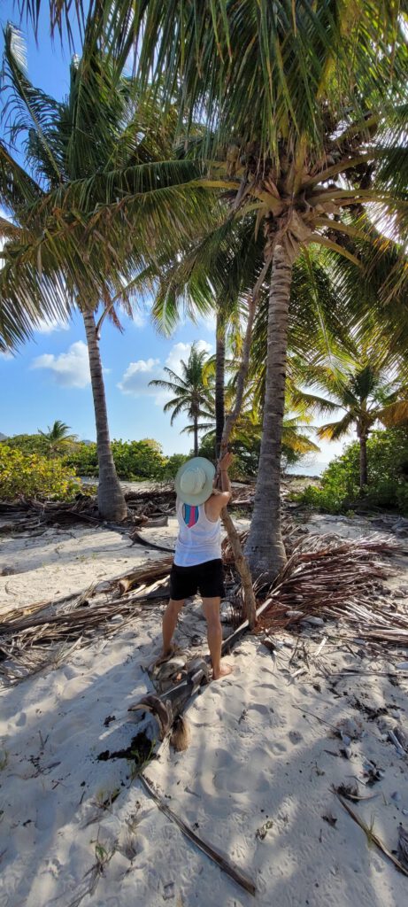 Nach einer Abkühlung machen wir uns also daran unsere Fertigkeiten in der Kokosnussernte zu erweitern und holen genug Kokosnüsse von den Bäumen um unsere leere Wasserflasche wieder zu füllen und uns an dem Kokosfleisch satt zu essen. Das mit dem Robinson Crusoe spielen funktioniert also schonmal. Gut zu wissen für eine eventuelle Strandung auf einer einsamen Insel. Der Rückweg ist nicht weniger abenteuerlich. Häufig müssen wir umdrehen, weil das Gewächs so dicht ist, dass wir nicht durchkommen. Beim nächsten Mal also doch die Machete einpacken. Völlig erschöpft, zerkratzt und mit Kletten übersäht kommen wir wieder bei dem kleinen Strand raus, wo unser Schlauchboot steht.