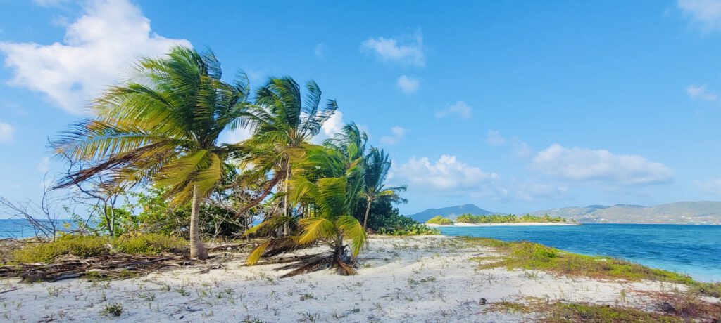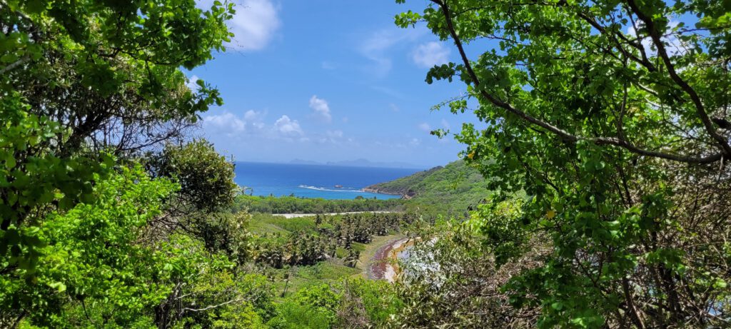 Zurück zu den schönen Dingen. Wir genießen den Ort, die Leichtigkeit und das Leben auf dem Wasser. Und das Vagabunden Dasein, denn als wir genug haben, gehts einfach einmal um die Ecke, zur nächsten Insel. Noch eine Nummer kleiner. Petit Martinique hat nur noch 900 Einwohner und wir umrunden sie an einem Nachmittag. Die eine Straße, die hier betoniert ist, endet hinter den letzten Häusern im Süden und geht in einen Feldweg über, ab hier gibts nur noch karge, trockene Landschaft. Man sieht den vulkanischen Ursprung an vielen Stellen und Schafe oder Ziegen. Es geht immer höher und irgendwann kommt ein Abzweig zum höchsten Punkt, den Piton. Der Aufstieg ist steinig und abenteuerlicher als erwartet. Die Aussicht auf die vielen verschiedenen Blautöne, die das Meer durch die Riffe und Sandbänke rund um die Insel zaubert, bringen mich zum schwärmen. „Guck dir das blau an, dunkel, hell, türkis. IS – DAS – SCHÖN“ entfährt es mir bei dem Aufstieg immer wieder, obwohl er schweißtreibend ist und die Mittagssonne mal wieder knallt. Obwohl es doch bewölkt sein sollte. Wir hatten uns schon so gefreut. Naja.