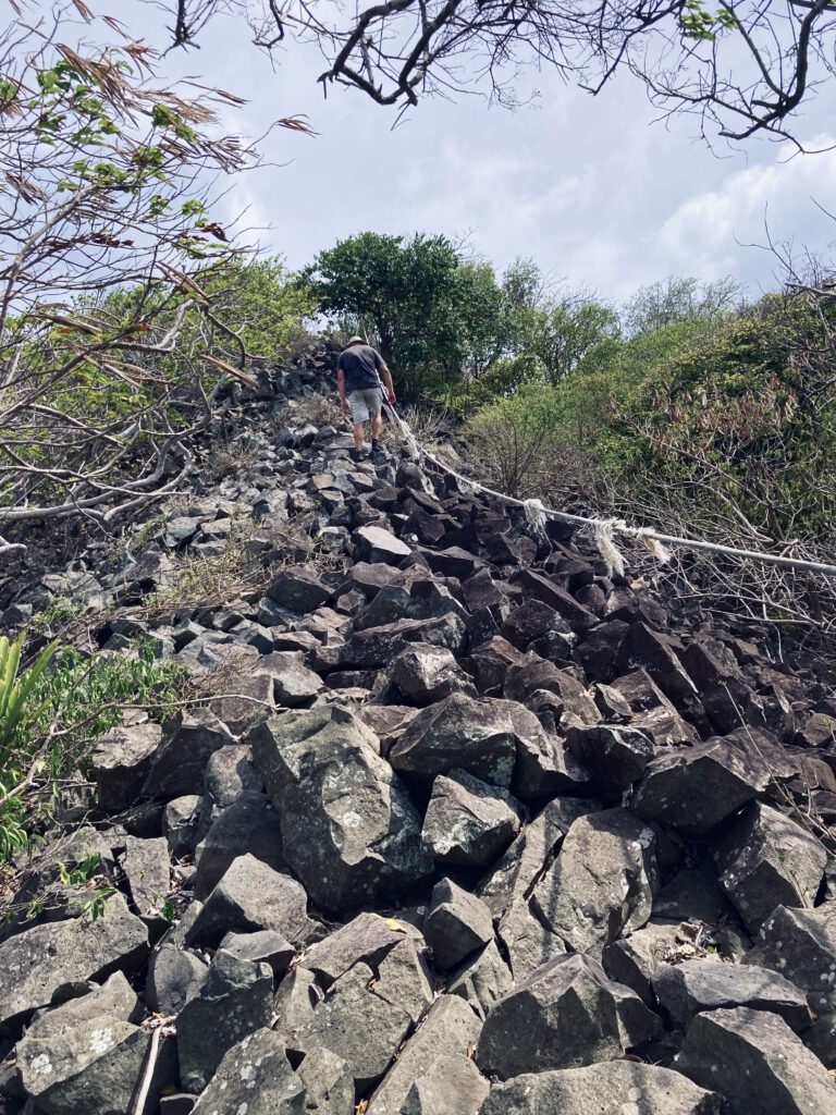 Auf dem Weg nach unten ist der Blick eher auf den Boden gerichtet. Stein um Stein, mit Hände benutzen. Das ist was für Nici. Danach geht der Weg weiter im Norden der Insel und wir beenden unsere Umrundung auf einer schattigen Bank auf der Hauptstraße. Die erste Begegnung zeigt, dass „englisch“ hier ist noch schwerer zu verstehen als in Carriacou. Oder hat er keine Zähne mehr? Sehr an uns und einem Gespräch ist der ältere Herr trotzdem interessiert, auch wenn er alles dreimal sagen muss. Wir begegnen unserem gesprächigen Freund ein paar Stunden später wieder und die paar Bier, die er sich gekippt hat in der Zeit, machen die Unterhaltung nicht besser. Auf der Suche nach etwas zu essen am Sonntag Nachmittag sind wir hier vergebens. Aber zur Muttertagsparty sollen wir kommen. Also erstmal zu Hause was essen und eine Runde im Wasser abkühlen und dann gehts nochmal los. Auf der Party gibts leckeren Rum Punsch und eine gute Gelegenheit sich die Menschen anzuschauen. Die Musik ist gut, unbekannt und vor allem laut. Ohrenbetäubend laut. Dadurch kommen wir aber auch nicht in die Verlegenheit Gespräche zu führen, die wir nicht verstehen. Aber wir kommen uns ein bisschen vor wie auf einer Dorfparty, bei der jeder jeden kennt, nur wir nicht. Und dazu kommt noch, dass es ganz offensichtlich ist, dass wir hier nicht hin gehören. Ein bisschen befremdlich also schon.