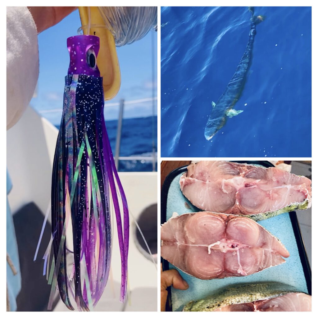 Denn mit diesem Haken holen wir auch einen zwölf Kilo schweren Mahi Mahi an Bord. Der sieht furchteinflösend aus, liefert aber 128 Zentimeter grätenfreies butterweiches Fleisch. Gut dass der Kühlschrank sich inzwischen etwas geleert und Platz geschaffen hat. Mehrere Tage gibt Doraden-Steak, Fischfilet und Fischcurry.