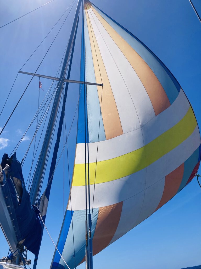 Also packen wir das Leichtwindsegel aus… das haben wir zuletzt auf der Atlantik-Überquerung benutzt. Da hielt es nur zwei Tage. Die damals gerissenen Leinen haben wir ausgetauscht und die Scheuerstelle beseitigt, aber auch jetzt will es nicht länger als zwei Tage oben bleiben. Obwohl es doch so schön aussieht und uns so gut vorwärts zieht mit seiner riesigen, fliegenden bunten Fläche.