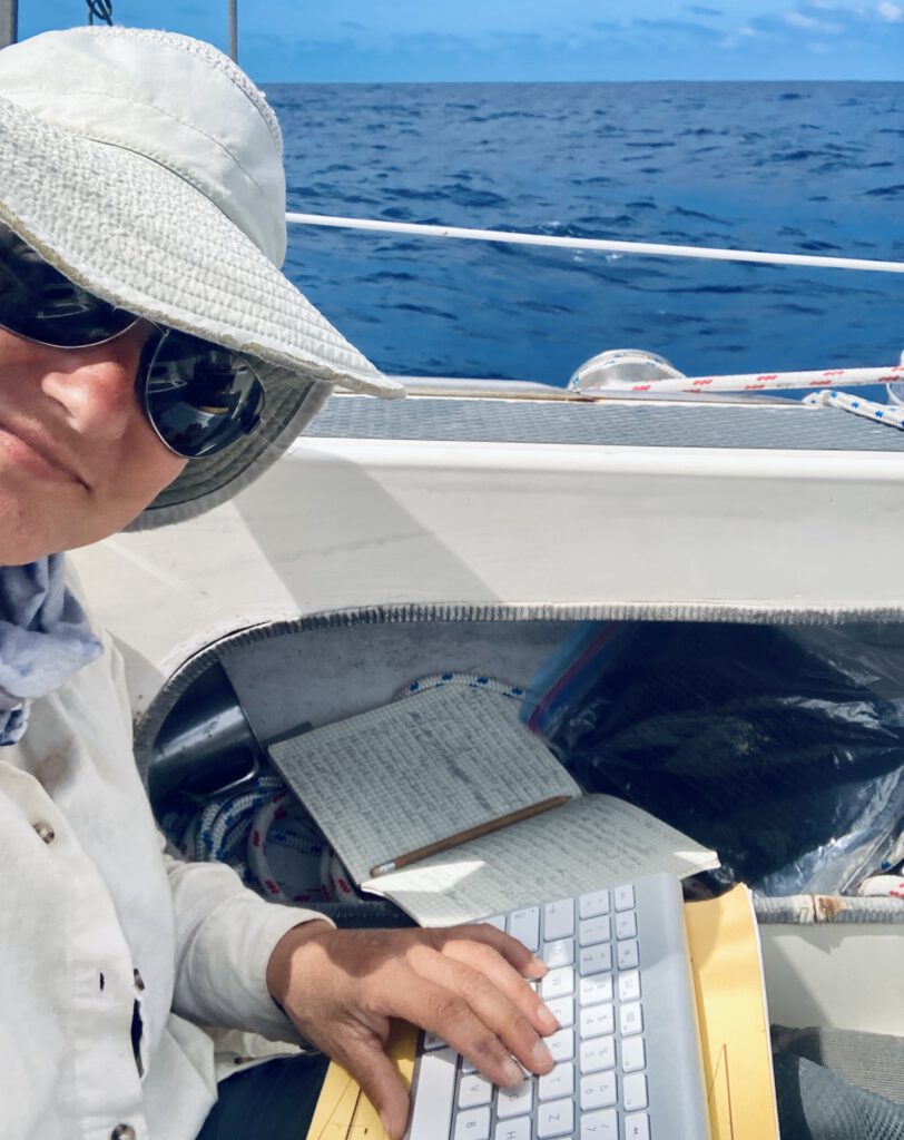 Da ich in vier Stunden meine Wörter, die eine Frau so am Tag zu verbrauchen hat, nicht alle loswerden kann, schreibe ich viel. Mein Buchprojekt nimmt Gestalt an. Nachdem ich ausgiebig eine Stunde am Vormittag mit einer Tasse Kaffee auf die Wellen gestarrt habe und munter geworden bin, sitze ich mit meiner Funktastatur auf dem Schoß im Cockpit. Das IPad als Bildschirm liegt im Schatten… mit einer Tüte Gegen Spritzwasseregeschützt. Nicht das bequemste, aber die beste Aussicht.