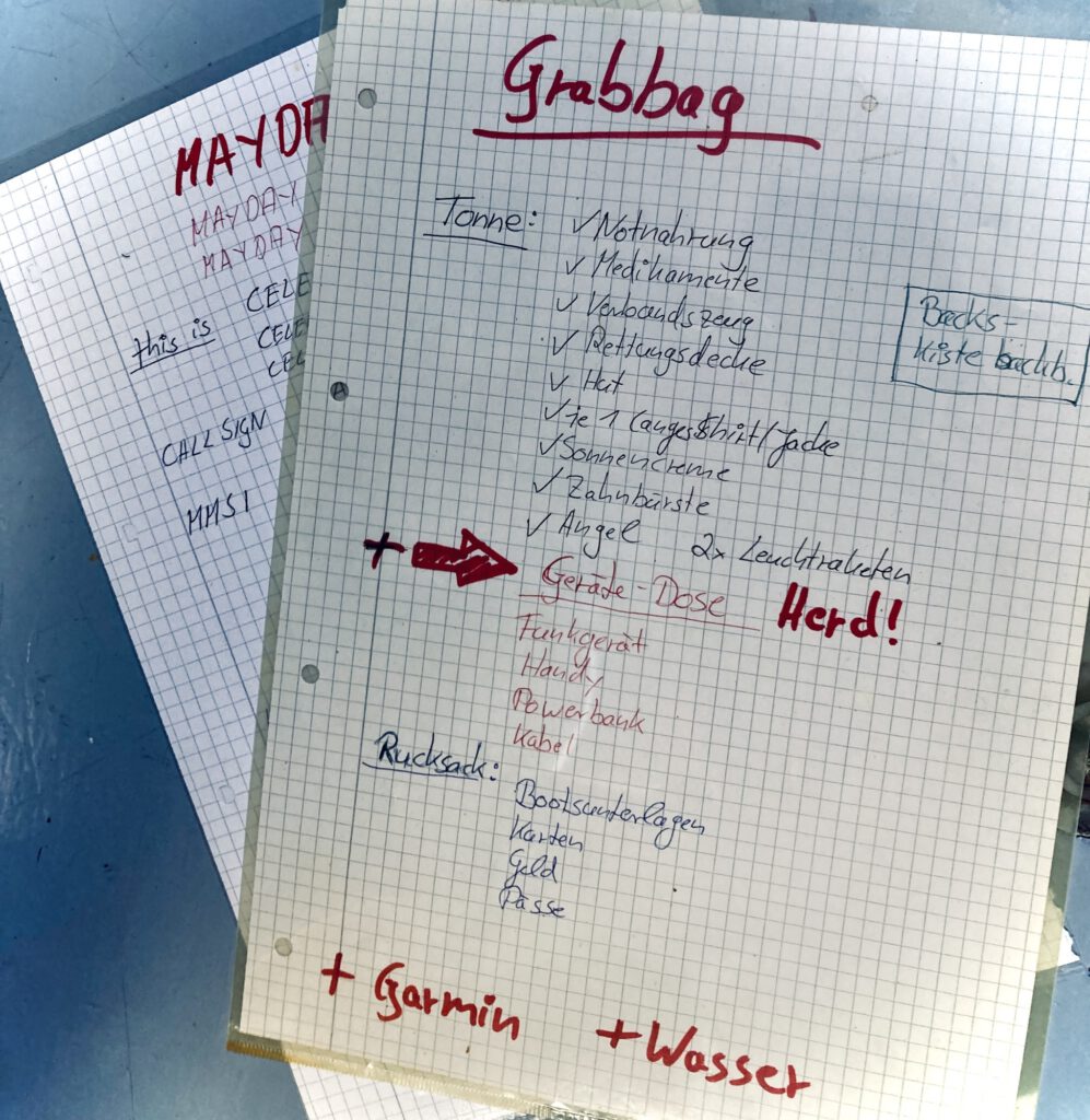 Zu guter letzt in der Überfahrts-Vorbereitung sitze ich im Boot, umgeben von Leuchtraketen, Medikamenten und Zipperbeuteln und schreibe eine Liste fürs Überleben. Für den worst case. Und denke dabei: in keinem Moment meines früheren Landratten-daseins habe ich mich je so intensiv mit dem puren Überleben beschäftigt, wie vor einer Ozeanüberquerung.