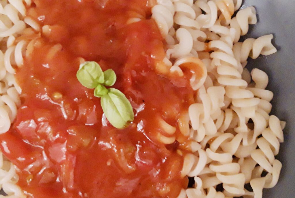 Die Tomatensauce besteht aus Zwiebeln, Zucker, Tomatenmark und passierten Tomaten. Ketchup tut‘s auch, aber den haben wir selten vorrätig an Bord.