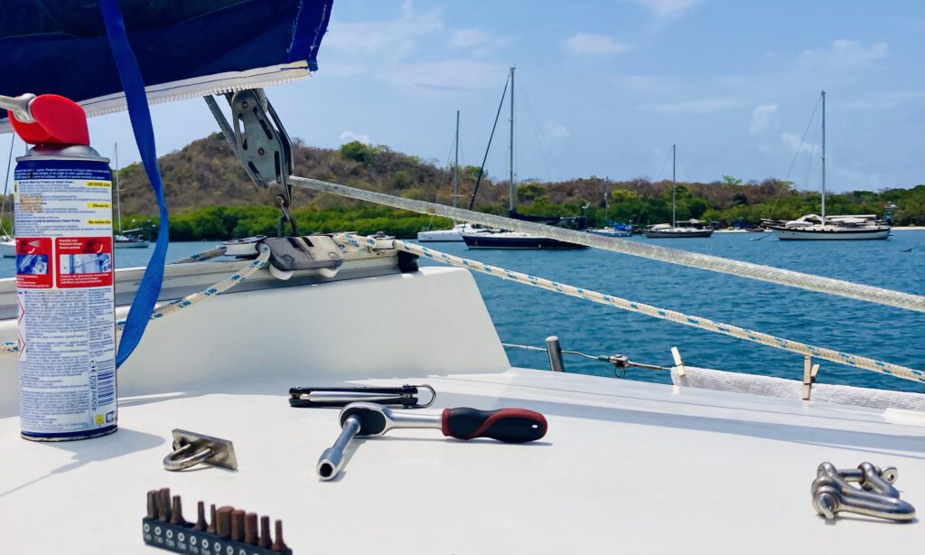 „Klong, klong, klong“ schallt von den Hügeln um die Bucht das dumpfe Echo wieder. Mit jedem Hammerschlag auf die Schienen am Großbaum bewegt sich das Segel ein paar Millimeter weiter in der Nut bis wir es am Ende herausziehen können. Die Sonne brennt inzwischen und neben Möwengeschrei, zerschneidet nur unser unrhythmisches hämmern die ruhige Inselidylle. Eine halbe Dose WD40 ist schon drauf gegangen und jede Menge Zeit. Stück für Stück bauen wir alles am Boot ab, was lose ist, lose sein sollte, oder irgendwie eine Windangriffsfläche bietet. Unter Deck wird alles verstaut, geputzt und alle Lebensmittel Kriechtier sicher verpackt. Mit dieser Aufbruchsstimmung vergehen die letzten Tage auf Grenada, während wir am Abend am Strand Bier mit bekannten Gesichtern trinken und die letzten Tage Karibik genießen.