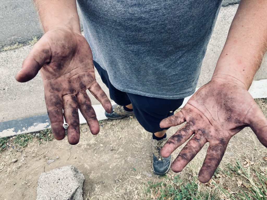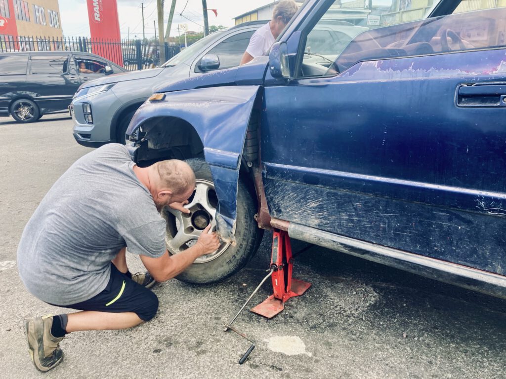 Mit dem vorhandenen Wagenheber versucht Heiko das Rad wieder provisorisch dran zu bekommen, um das Auto immerhin von der Straße schieben zu können. Aber er ist nicht hoch genug. Kurz darauf hält ein KFZ-Mechaniker und regelt die Sache mit seinem Werkzeug. Währenddessen passiert noch ein Auffahrunfall im Verkehr dahinter, weil wir wohl etwas die Sicht versperren.