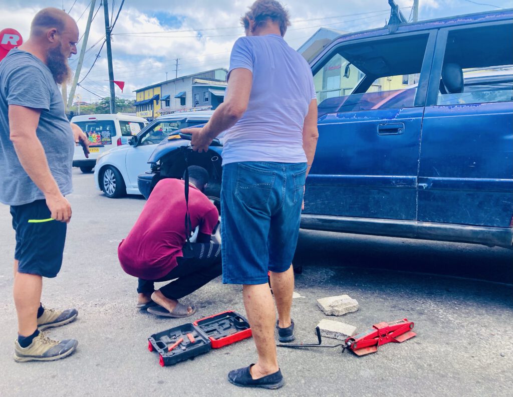 Unsere Bootsnachbarin bot uns an, uns zum Flughafen mitzunehmen. Bei der Abfahrt an ihrem Boot springt der Außenbordmotor nicht an. Nach einer Paddelfahrt zum Strand, nimmt sie dort das Boot ihres Mannes – der Barbesitzer. In das schwere Holzboot passen wir immerhin alle mit unserem Gepäck auf einmal. Die Steuerung muss allerdings Heiko übernehmen, weil es so schwer zu fahren ist. Am Steg angekommen packen wir uns ins Auto. Es springt an, aber kein Gang lässt sich einlegen. Zum Glück wohnt der Mechaniker direkt daneben und wird erstmal aus seiner Siesta geholt. Erstmal funktionieren die Gänge wieder, zumindest einige. Reicht, um weiterzufahren. Nach der Hälfte der knapp 20 Minütigen Fahrt kracht es plötzlich in der Kurve eines Kreisverkehrs und wir stehen. Nur etwas schief. Am Straßenrand rollt unser Vorderrad vorbei. Ups. Das sollte eigentlich fest sein.