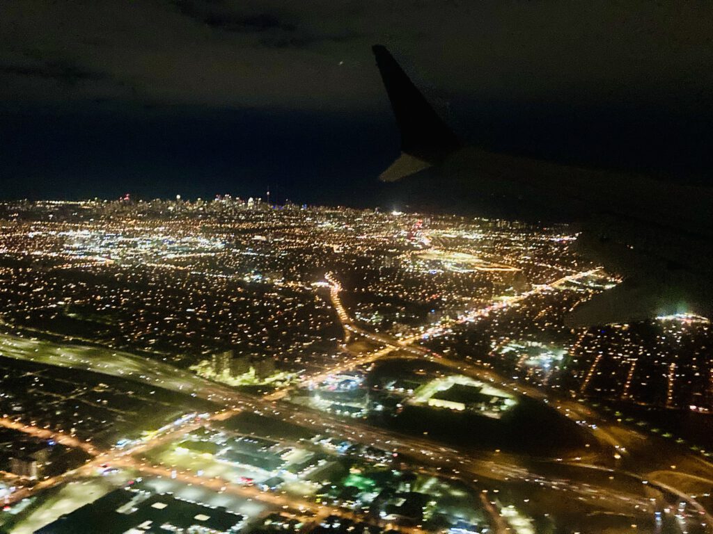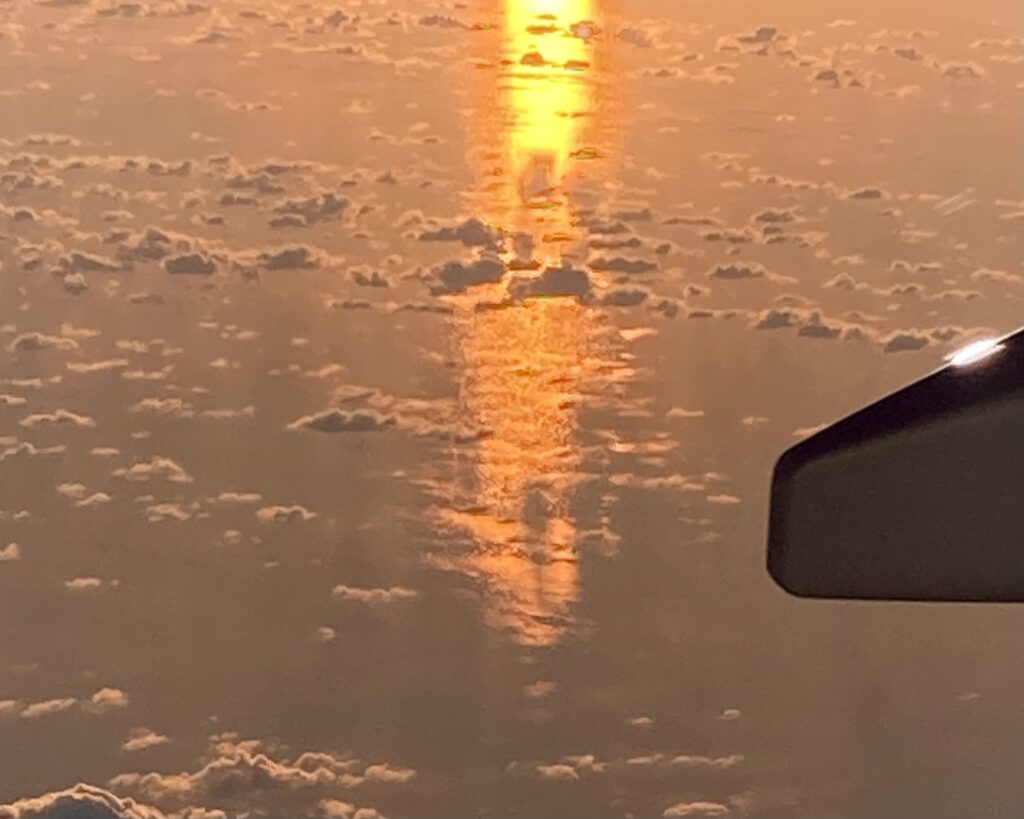 Auf dem Flug werden wir mit einem Blick auf unser Boot belohnt und ich schaue stundenlang aus dem Flugzeugfenster zu wie Sonnenuntergang und Wolken sich im karibischen Meer spiegeln. Auch die Aussicht bei Nacht ist mit Blitzen und einem Flug über New York wirklich spannend.